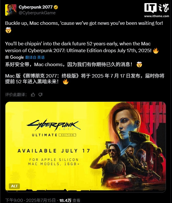 - 2025-07-20《赛博朋克2077》Mac版7月17日上线, 支持M系列芯片但需16GB内存